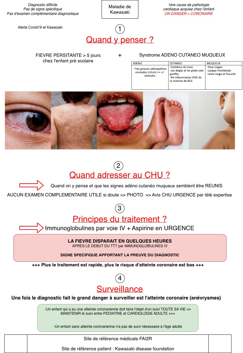 Elle doit impérativement être évoquée face à une fièvre persistante depuis 5 jours associée à des signes cutanéo-muqueux (éruption, conjonctivite, angine).