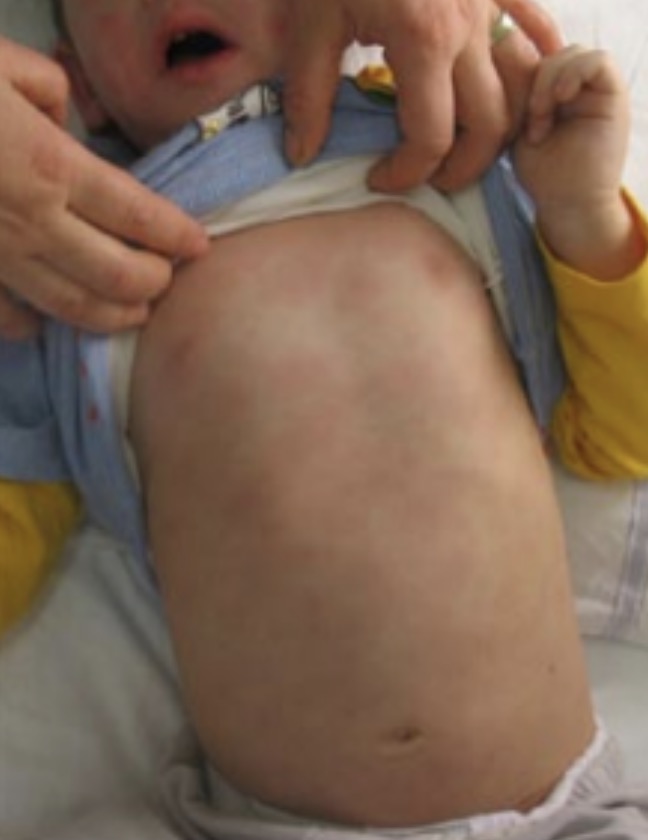 Il n’existe pas d’aspect œdémateux au niveau du visage. L’état général s’est dégradé depuis le début des symptômes et l’enfant n’a rien mangé depuis 48 heures, en dehors de 2 biberons de 100 ml de lait de croissance chocolaté.