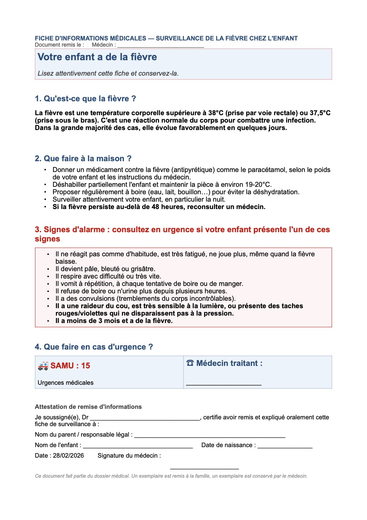 Bonus 🎁 : voici une fiche à remettre aux parents chez un enfant fébrile. Cette fiche a une valeur informative et donc médico-légale :
