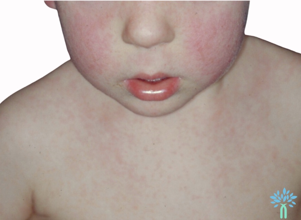 Le mégalérythème épidémique donne plutôt une éruption localisée au niveau du décolleté et des membres supérieurs avec un aspect souffleté des joues, avec peu de retentissement sur l’état général de l’enfant en raison d’une fièvre plus modérée.
