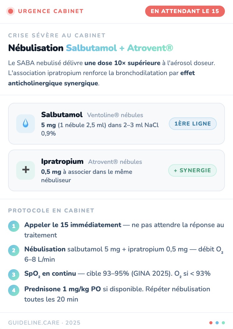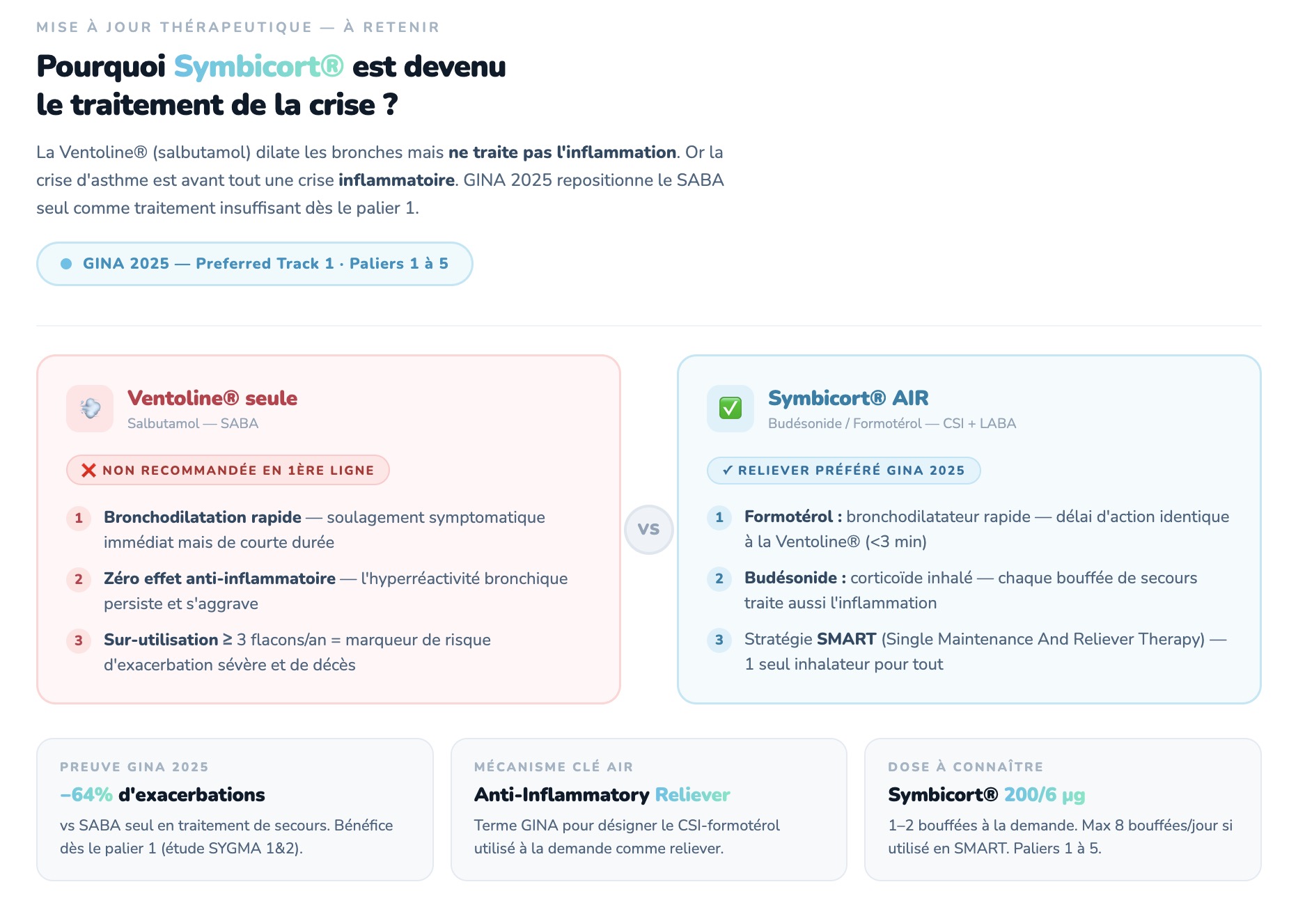 1)La Ventoline® seule n'est plus le traitement de secours de 1ère ligne. Dès le palier 1, GINA 2025 recommande le CSI-formotérol à la demande (stratégie AIR) — chaque bouffée de crise traite aussi l'inflammation. L'utilisation de ≥ 3 flacons de SABA par an est un signal d'alarme de sous-traitement.