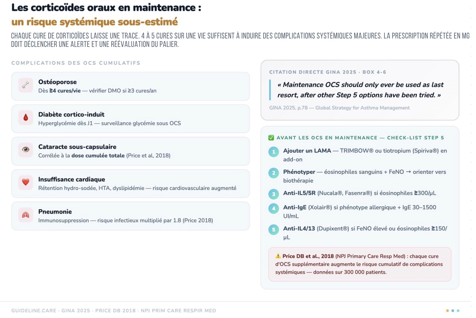 7) Les corticoïdes oraux en maintenance sont un dernier recours absolu. GINA 2025 est explicite : 4 à 5 cures d'OCS sur une vie suffisent à induire ostéoporose, diabète cortico-induit, cataracte et insuffisance cardiaque. Avant d'y recourir, LAMA puis biothérapie doivent avoir été essayés et discutés en pneumologie.