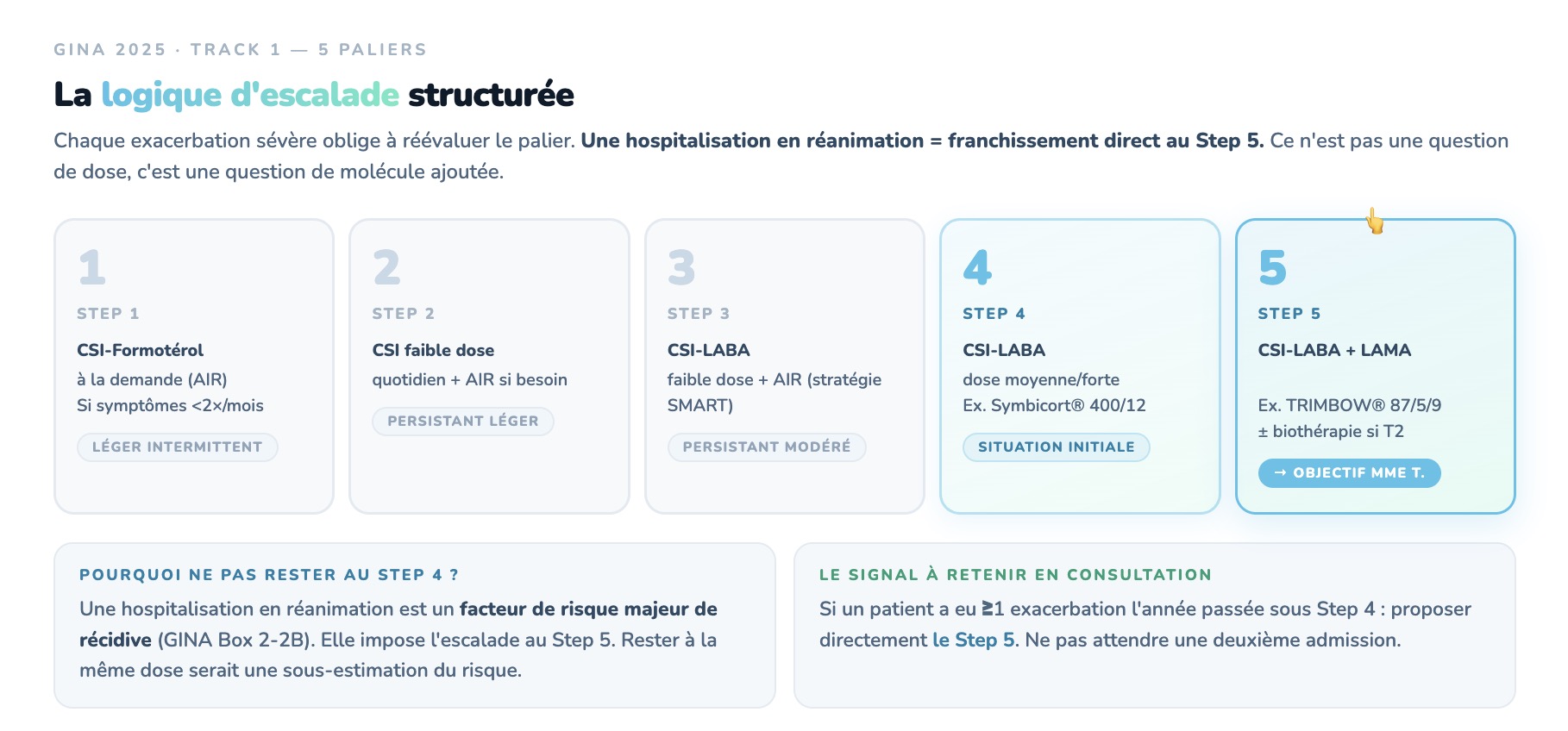 4) Chaque escalade thérapeutique = une molécule ajoutée, pas une dose augmentée. Doubler les doses de CSI-LABA n'a pas démontré de bénéfice supérieur à l'ajout d'une troisième molécule. La logique GINA est structurelle, pas quantitative.