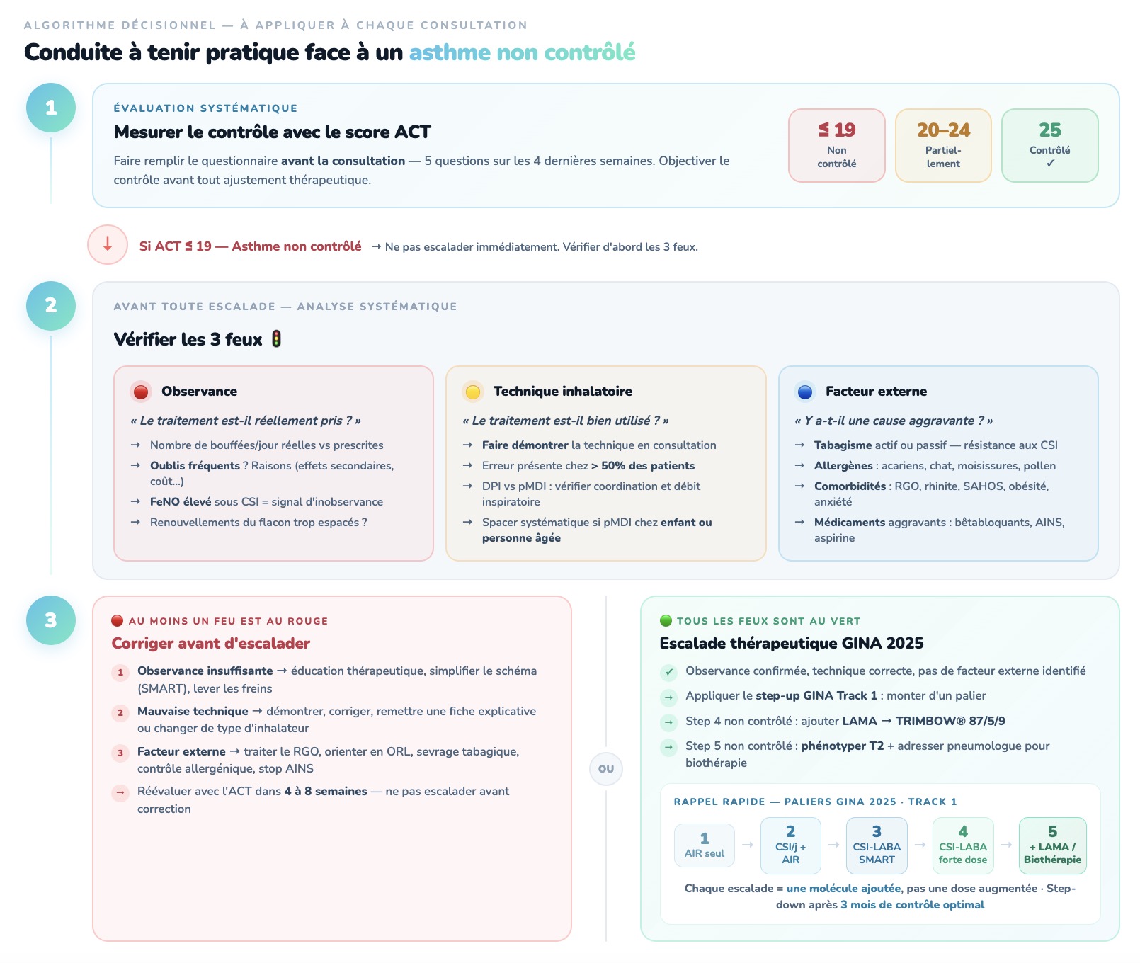 5) Avant d'escalader, vérifier systématiquement les 3 feux : observance réelle, technique inhalatoire (erronée chez > 50 % des patients), et facteur externe de mauvais contrôle (tabac, RGO, rhinite, SAHOS, médicaments aggravants). Une escalade sur mauvaise observance est une erreur thérapeutique.
