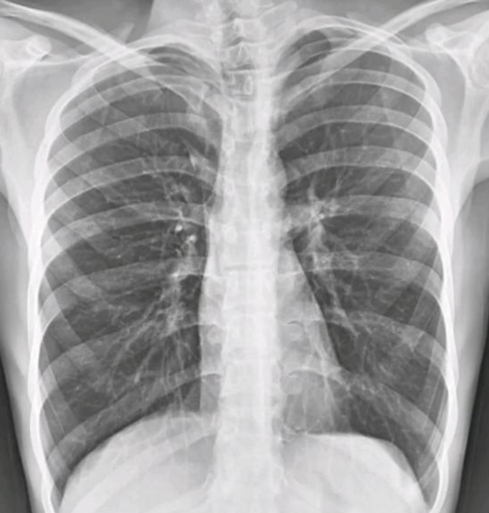 Ici, aucun de ces éléments n'est présent 👉 Le cliché montre au contraire une hyperclarté diffuse des deux champs pulmonaires avec des coupoles basses et des côtes horizontales, en parfait contraste avec l'aspect d'une pneumonie.
