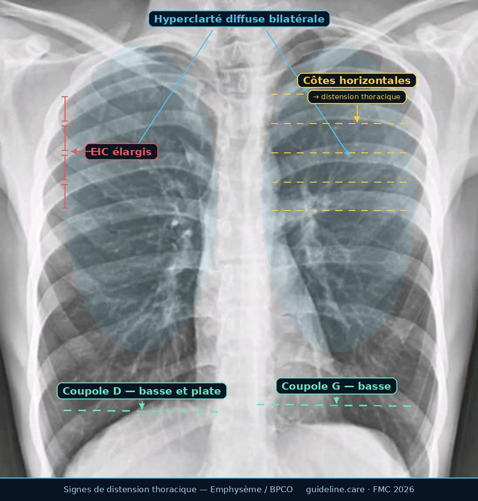 Ces signes traduisent un emphysème, complication fréquente de la BPCO. Attention ! la radio seule ne confirme pas le diagnostic — elle oriente seulement.