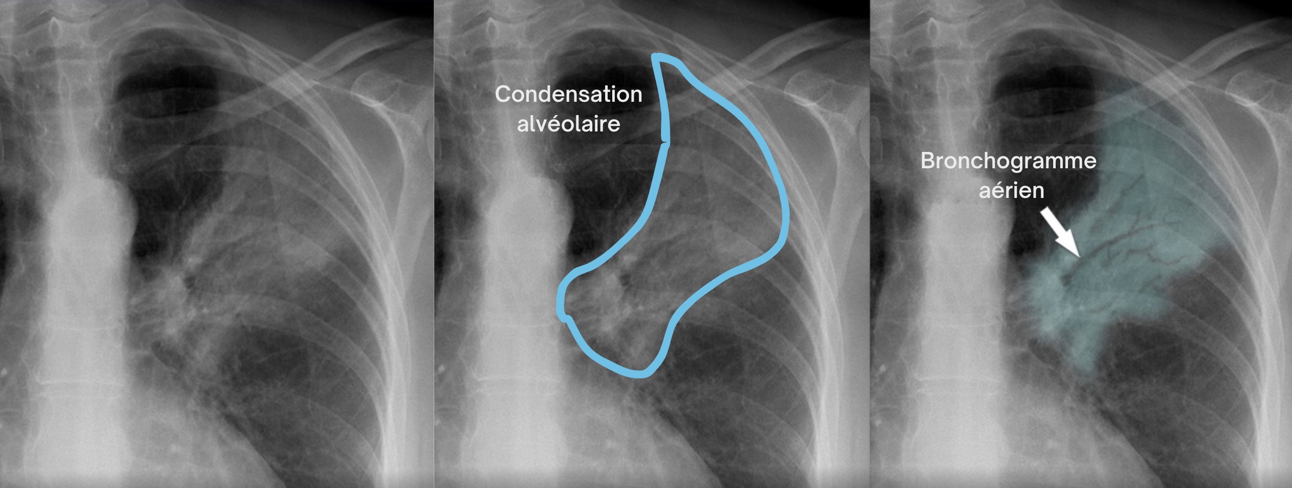 Critères radio d'une pneumonie : condensation alvéolaire systématisée, bronchogramme aérien.