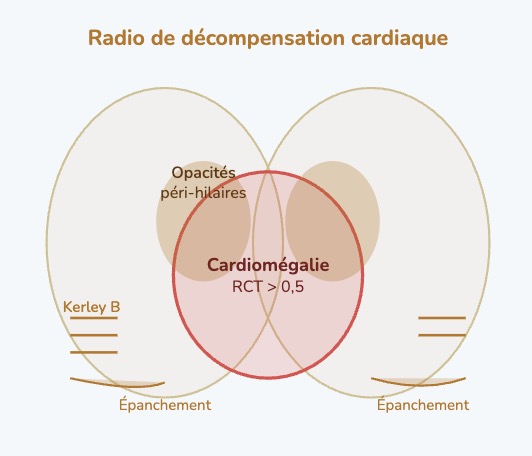 Réponse C : Faux, la décompensation cardiaque gauche (OAP) présente à la radio une sémiologie distincte et reconnaissable. On recherche : cardiomégalie (rapport cardiothoracique RCT > 0,5 mesuré sur un cliché PA en inspiration), opacités péri-hilaires en ailes de papillon, lignes de Kerley B (opacités horizontales périphériques < 2 cm, témoins d'œdème interstitiel), et épanchements pleuraux bilatéraux prédominant à droite.