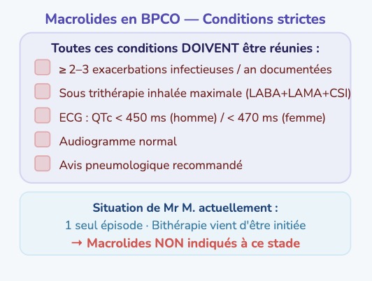 Réponse A : Vrai. Selon GOLD 2025, M. M. appartient au Groupe E (≥ 1 hospitalisation pour exacerbation dans l'année). Ce groupe impose une bithérapie LABA + LAMA d'emblée, quelle que soit la sévérité spirométrique.