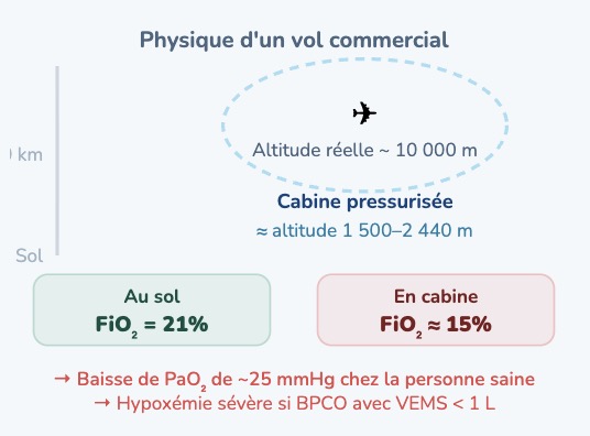 Concernant le risque de pneumothorax en vol : la pressurisation de la cabine est maintenue à une pression équivalente à une altitude de 1500–2440 m (FiO₂ ≈ 15%), ce qui réduit légèrement le volume gazeux. Le risque de pneumothorax in-flight existe mais est rare et non contre-indique pas le vol en l'absence d'antécédent récent. Ici, la vraie contre-indication potentielle est l'hypoxémie, pas le pneumothorax.