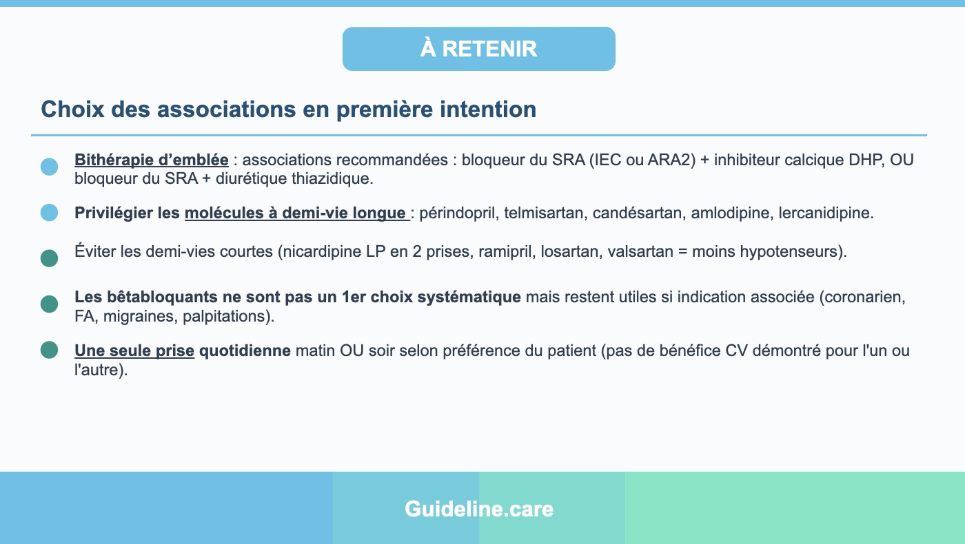 C'est la stratégie recommandée en première intention par les recommandations de l'ESC/ESH 2023 pour la majorité des hypertendus. Une bithérapie à dose standard permet une baisse de PAS d'environ 13 mmHg, avec un taux de contrôle atteignant environ 60 % des patients. Elle doit être prescrite en association fixe (comprimé unique) pour optimiser l'observance.