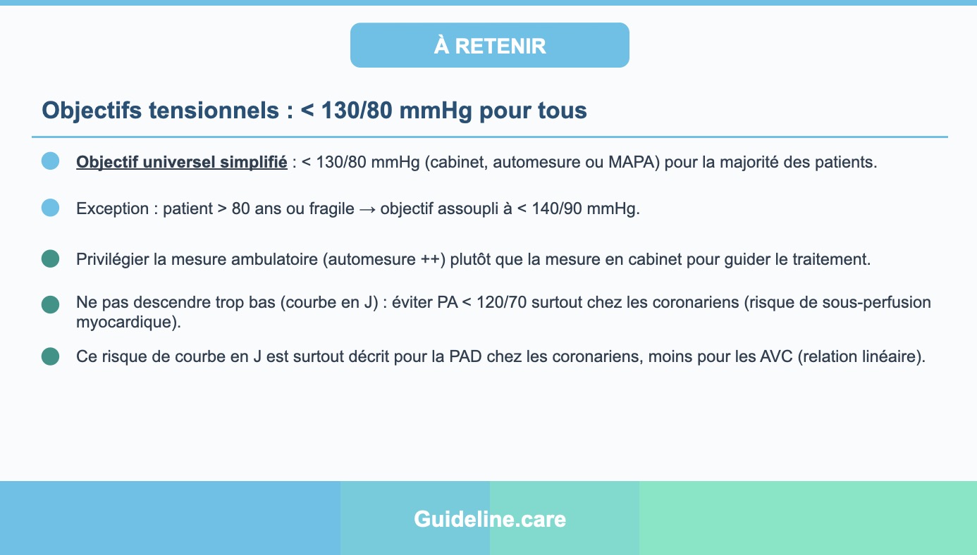 Viser < 120/70 mmHg expose à un risque de sur-traitement avec des complications potentielles : hypotension, chutes, insuffisance rénale aiguë, syncope. L'effet en J (J-curve) pour la pression artérielle diastolique est bien documenté, notamment pour la perfusion coronaire. Un excès de baisse tensionnelle peut donc aggraver le risque cardiovasculaire, particulièrement chez les patients âgés ou coronariens.