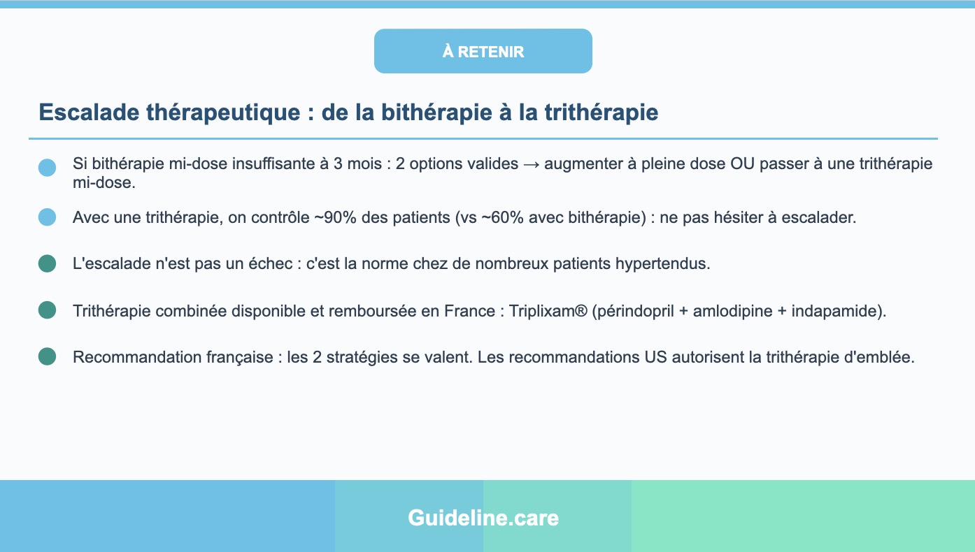 La trithérapie est réservée à l'étape 2, après échec d'une bithérapie à pleine dose. Débutée d'emblée, elle expose à un risque accru d'hypotension et d'effets indésirables, sans bénéfice démontré en initiation. Elle correspond au step 2 de l'algorithme ESC, permettant de contrôler ~90 % des patients. En cas d'HTA sévère résistante, une évaluation spécialisée s'impose avant d'envisager ce palier.