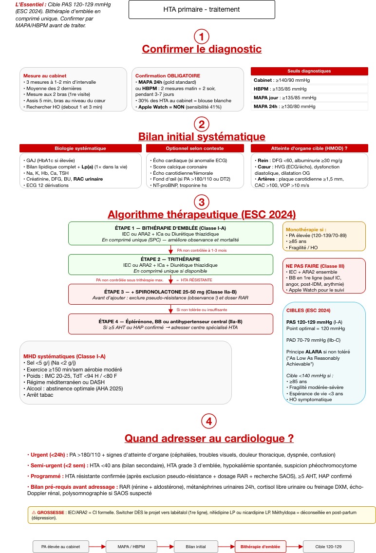 Réponse A : Vrai. Dès que l'HTA est confirmée (≥ 140/90 cabinet ou ≥ 135/85 automesure), on démarre le traitement médicamenteux en parallèle des mesures hygiéno-diététiques (MHD). L'objectif est de lutter contre l'inertie thérapeutique et d'obtenir un contrôle tensionnel à 3 mois. Comme le rappelle Dr Bertolino : on ne veut plus perdre de temps avec des patients qu'on revoit, qui n'ont pas fait les mesures, et qui finalement ne reviennent plus.