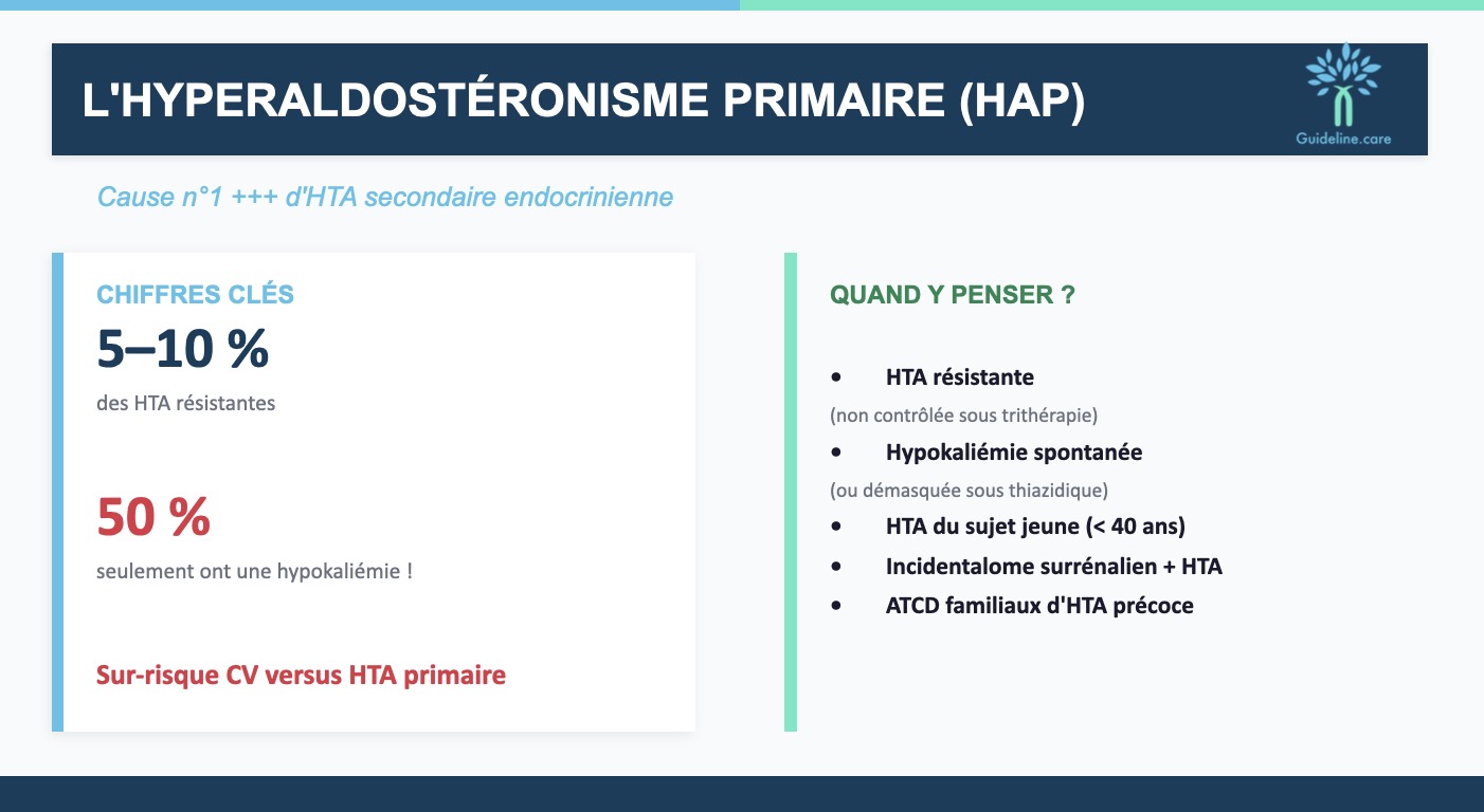 Réponse A : Vrai. L'hyperaldostéronisme primaire (HAP) est une cause très fréquente d'HTA secondaire +++. Cependant beaucoup de patients restent non diagnostiqués car la présentation est souvent peu bruyante. L'hypokaliémie est un signe d'alerte majeur, mais attention : elle n'est présente que chez environ 50 % des cas.