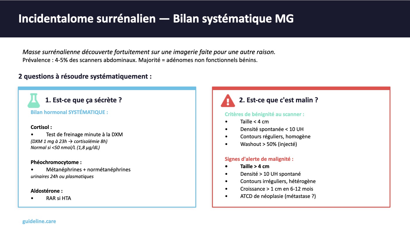 Réponse A : Vrai et Faux... Voici pourquoi => Le scanner surrénalien n'est pas l'examen de première intention pour le dépistage de l'HAP. Il intervient dans un second temps, une fois le diagnostic biologique posé, pour rechercher un adénome ou une hyperplasie bilatérale. En pratique hospitalière, il est souvent demandé en même temps que les dosages biologiques si la suspicion clinique est forte. En ville, il est préférable de confirmer biologiquement d'abord.