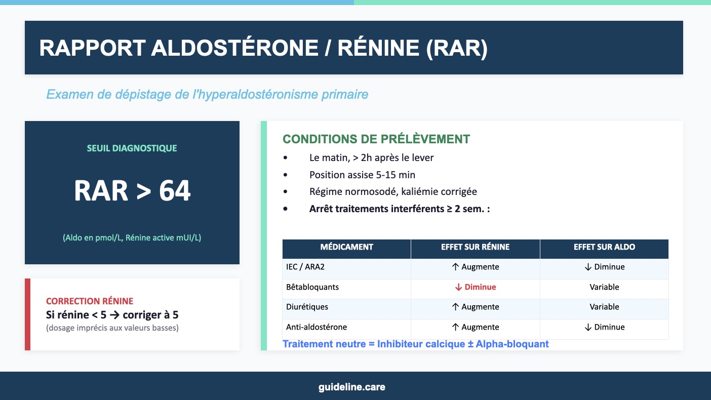 Réponse C : Vrai. Le rapport aldostérone/rénine plasmatique (RAR) est l'examen de dépistage recommandé de l'HAP. Un rapport > 64 (avec aldostérone en pmol/L et rénine active en mUI/L) est en faveur du diagnostic. Point crucial : lorsque la rénine est très basse (< 5 mUI/L), on corrige sa valeur à 5 pour le calcul du rapport, car les dosages ne sont pas fiables aux valeurs très basses. Idéalement, il faut deux dosages concordants pour confirmer le diagnostic.