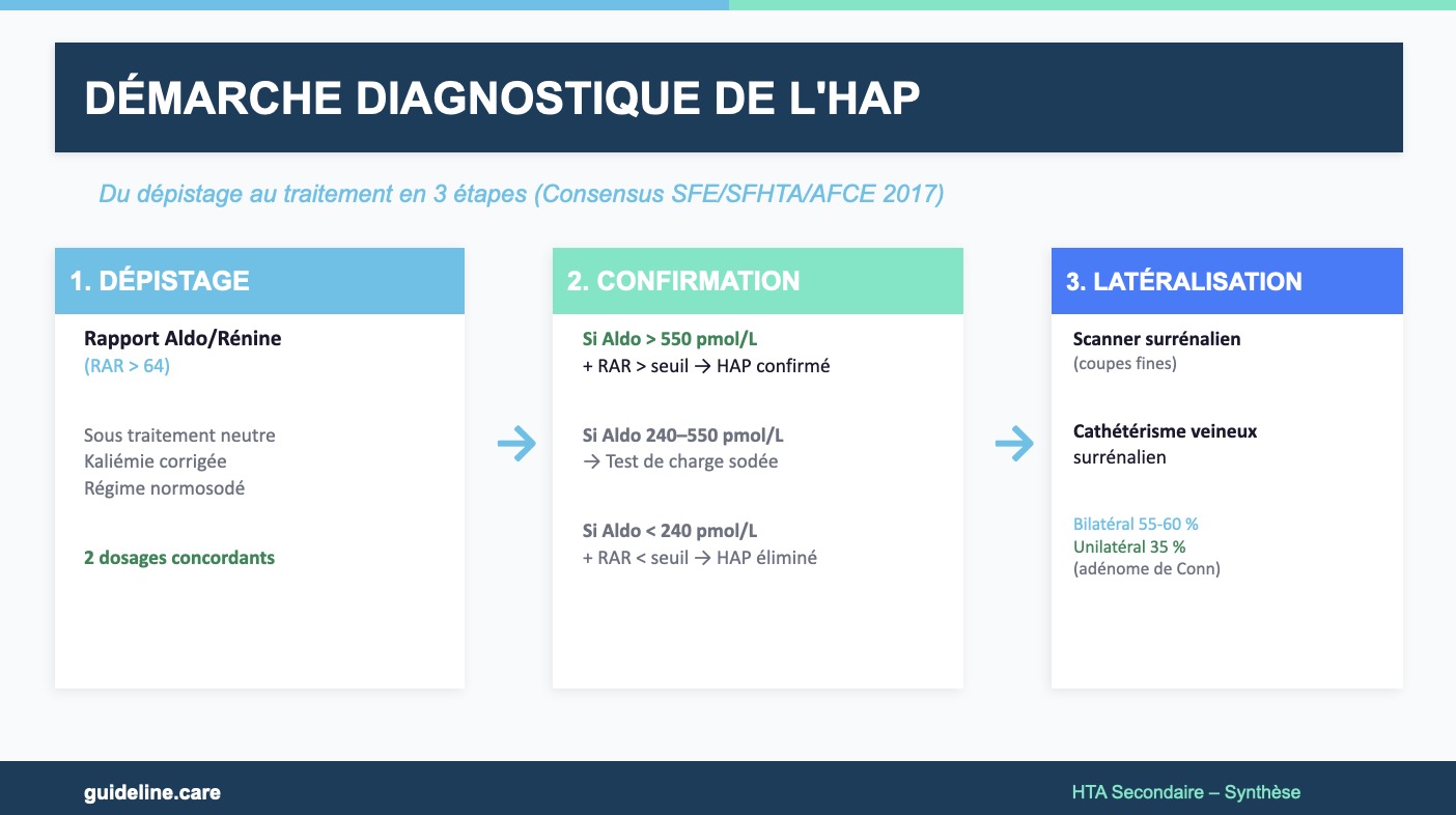 Réponse B : Faux. Le dosage de l'aldostérone plasmatique seule est insuffisant. Une aldostérone élevée de façon isolée ne permet pas de distinguer un HAP d'une stimulation secondaire du système rénine-angiotensine-aldostérone (par exemple sous diurétiques ou en cas de déshydratation). C'est le rapport aldostérone/rénine qui est discriminant, car dans l'HAP, la rénine est freinée alors que l'aldostérone est élevée.