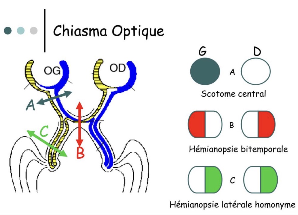 Retenez que l'adénome hypophysaire comprime le chiasma optique en 1er et que cela engendre une amputation du champ visuel sur les côtés... => hémianopsie bi temporale.